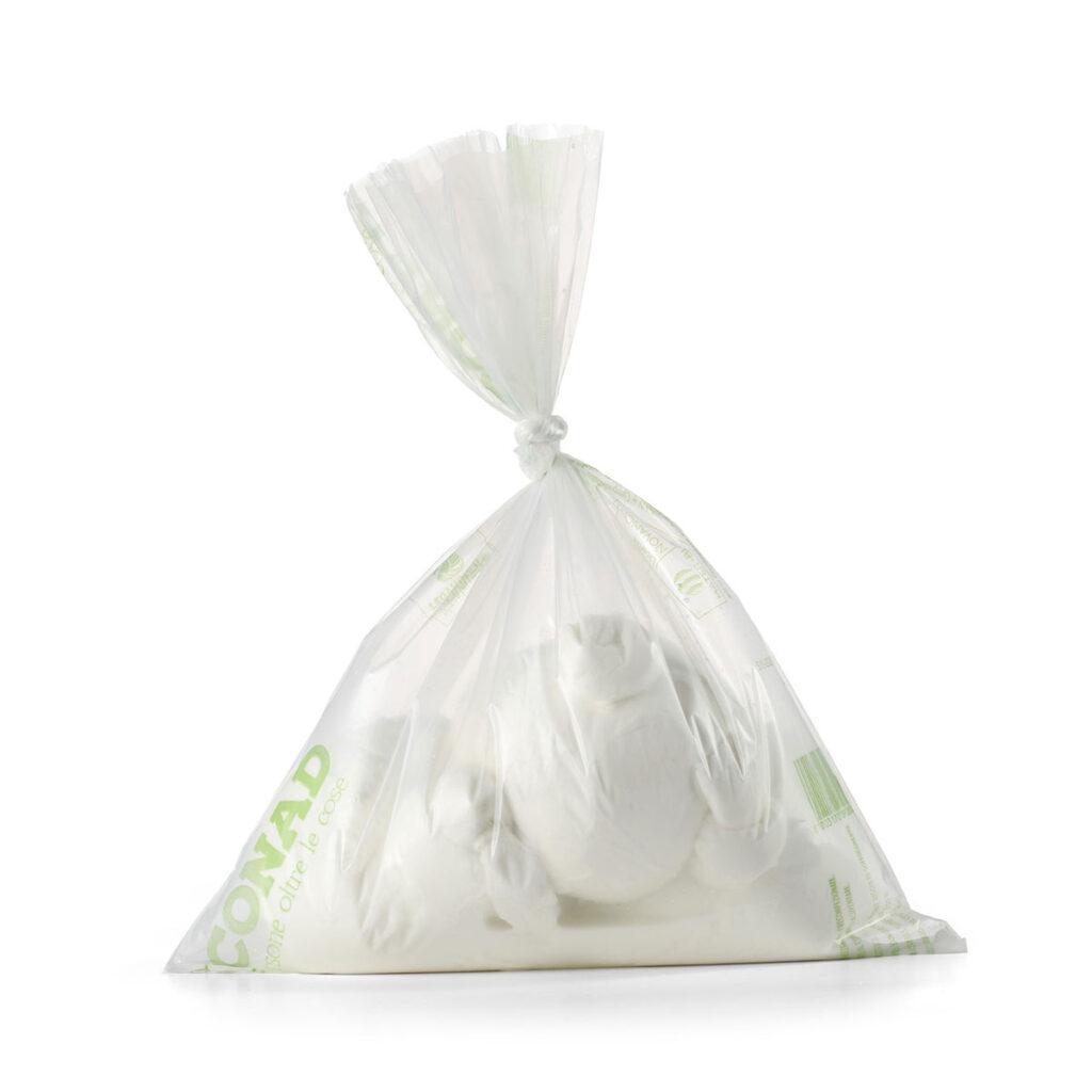 Sacchi bloccati BA compostabili Mater-Bi FV276 (alta trasparenza) Stampa 1 colore continuo “per alimenti + OK compost INDUSTRIAL”